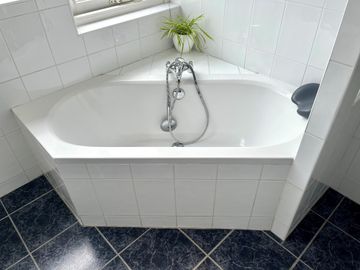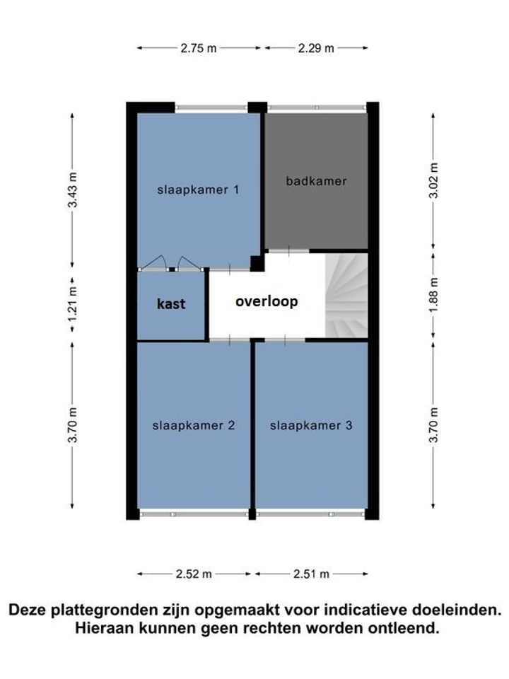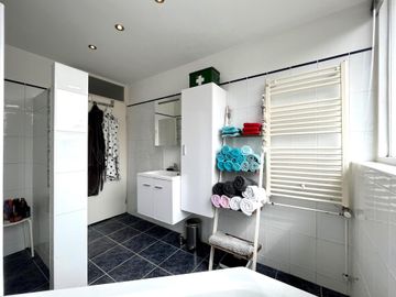 Overloop, 3 ruime slaapkamers van respectievelijk 3.40 x 2.75 met vaste kast, 3.70 x 2.50 met vaste kast en 3.70 x 2.50. Ruime badkamer met wastafelmeubel, ligbad en ruime inloopdouche met regen-/stortdouche.