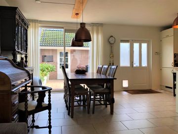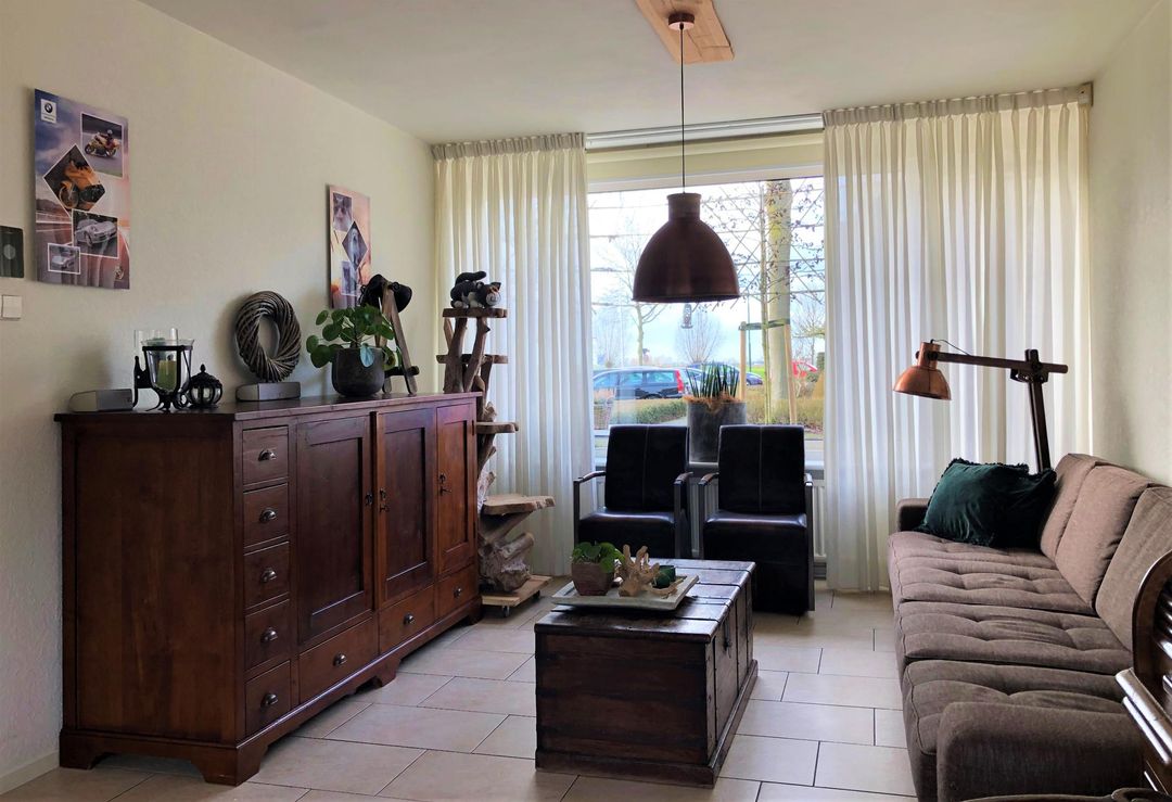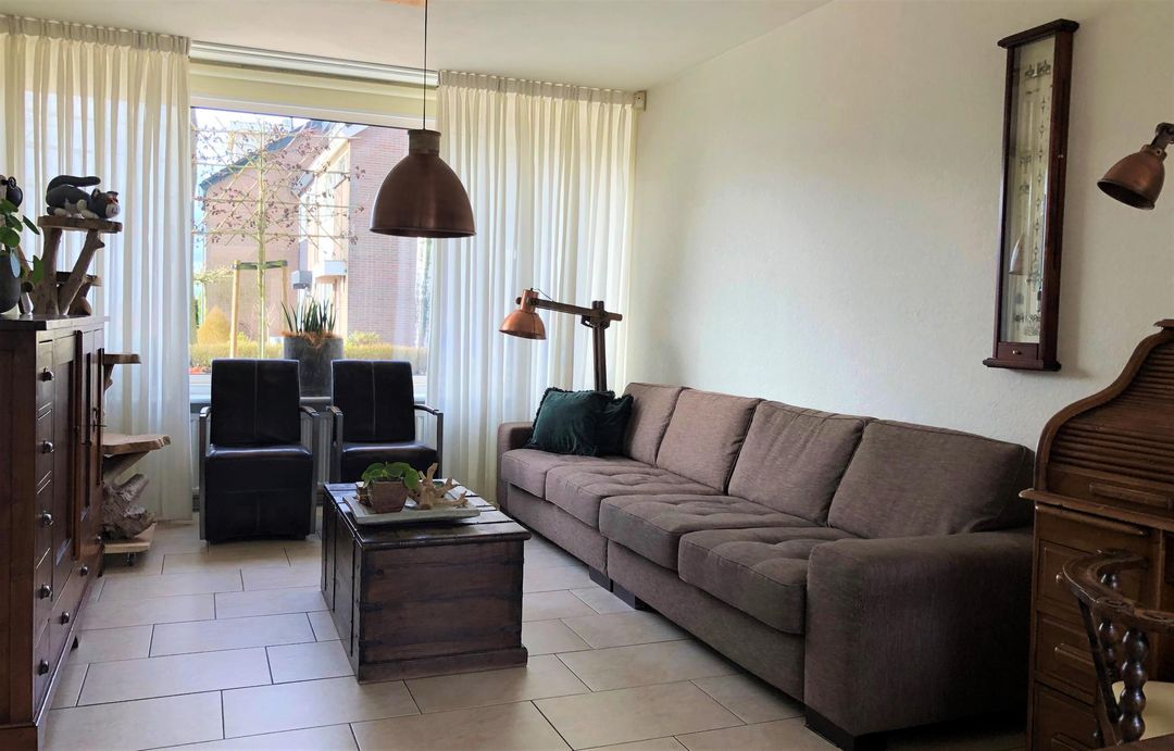 Mooie en lichte doorzon woonkamer met een plavuizen vloer (voorzien van vloerverwarming), een schuifpui naar de achtertuin en een open keuken.