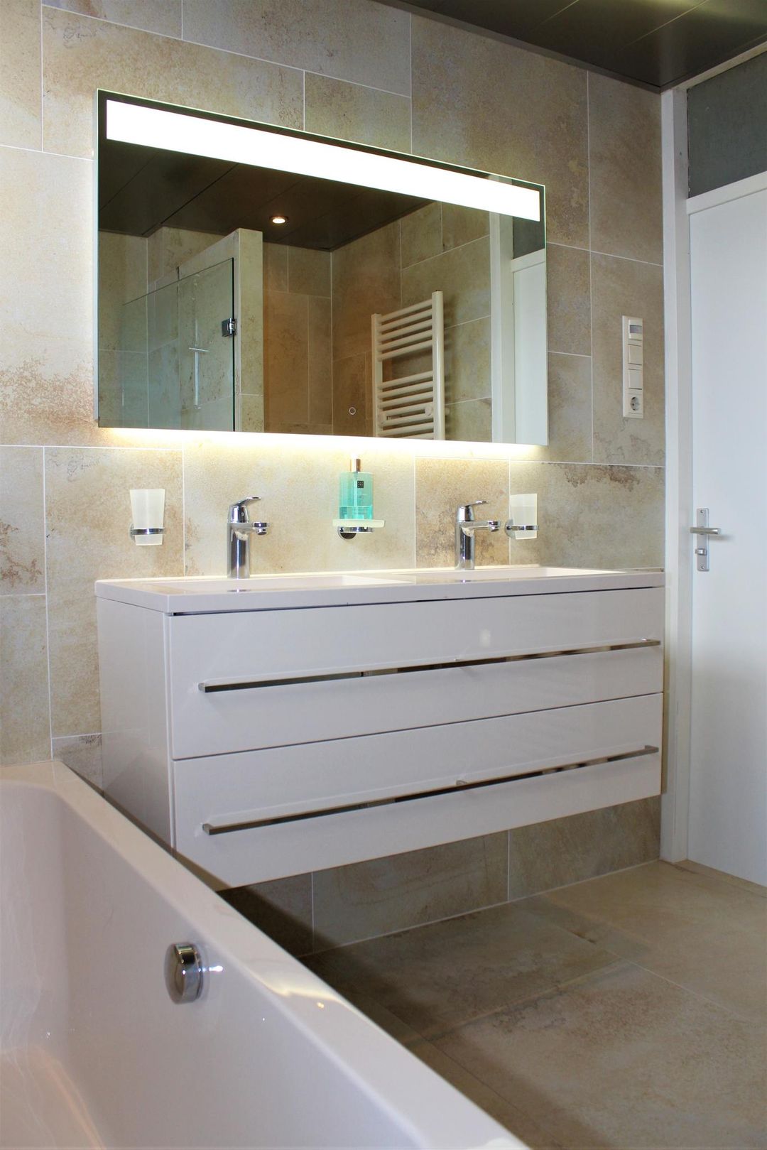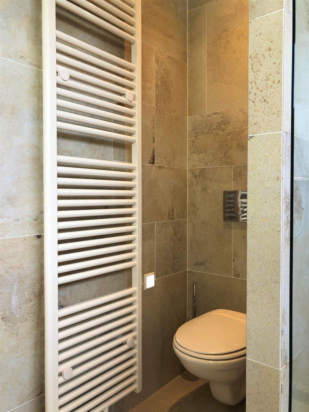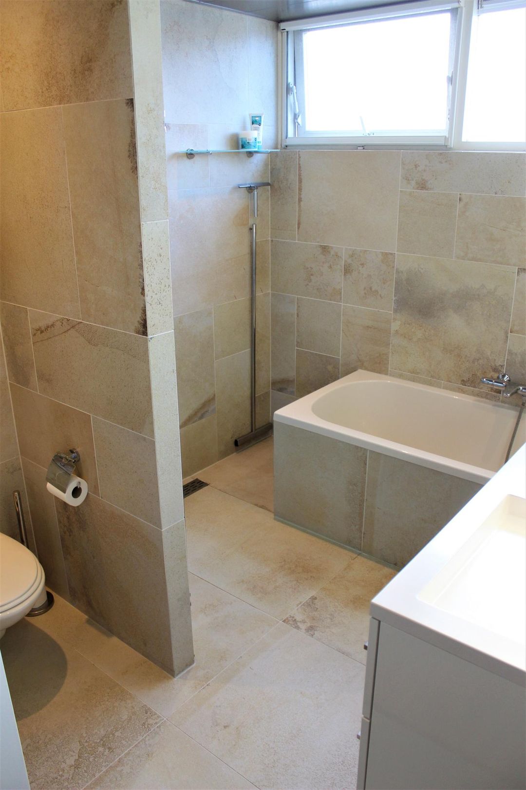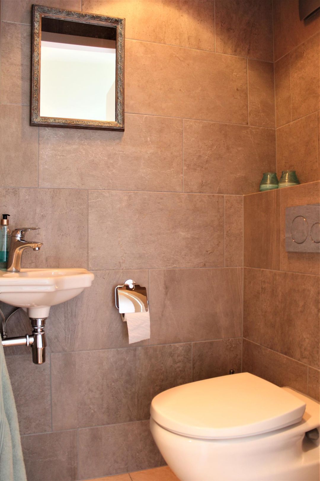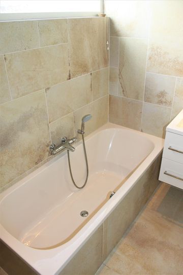 De badkamer is modern en uiterst compleet. Hier treft u een ligbad, inloopdouche, toilet en dubbele wastafel aan.