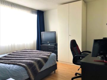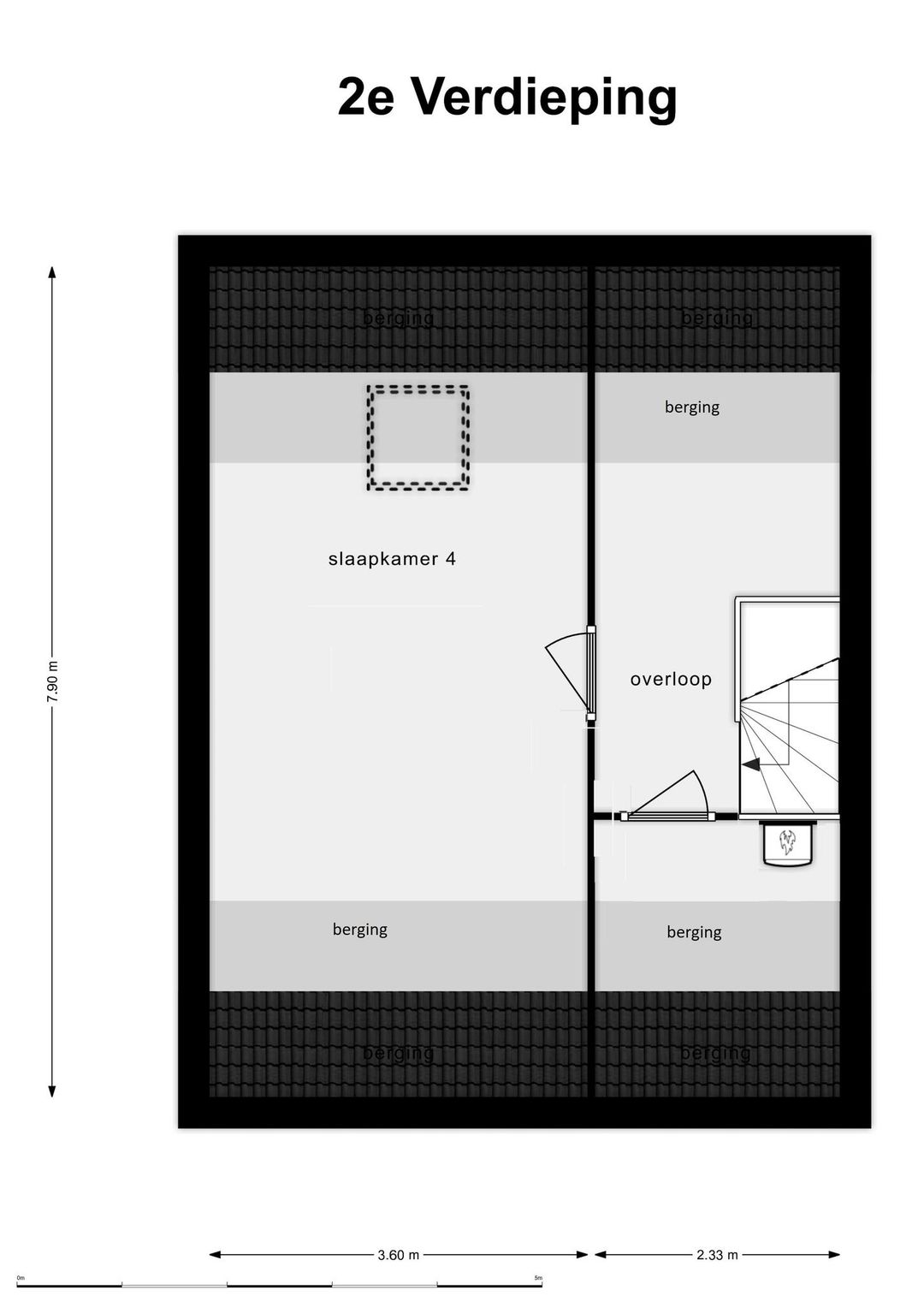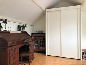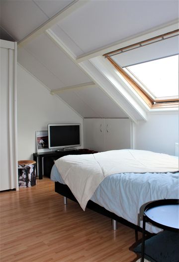 Een 4e slaapkamer met groot en nieuw dakraam, volop bergruimte, nette en lichte laminaatvloer en een oppervlakte van 16 m2.