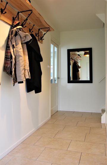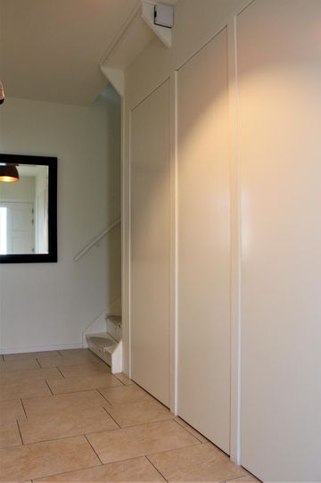 Entree/ruime hal met toiletruimte (modern), vaste kastruimte, meterkast, trapkast en extra opbergruimte in de trap verwerkt.
