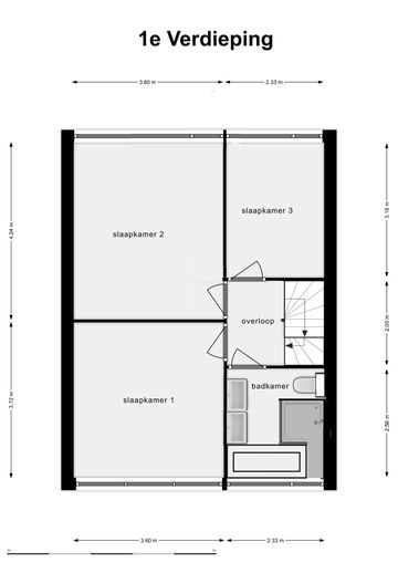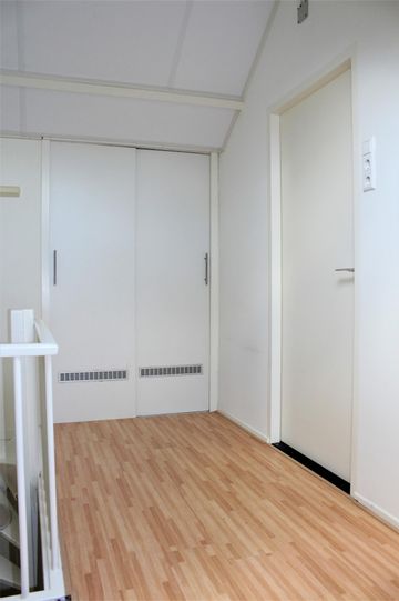 Overloop, drie ruime slaapkamers. De kamers zijn allemaal keurig afgewerkt, voorzien van een lichte en nette laminaatvloer, dubbele beglazing en hebben een oppervlakte van 15, 13 en 7 m2.