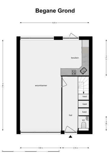 De oppervlakte van de woonkamer en keuken is samen 36 m2.