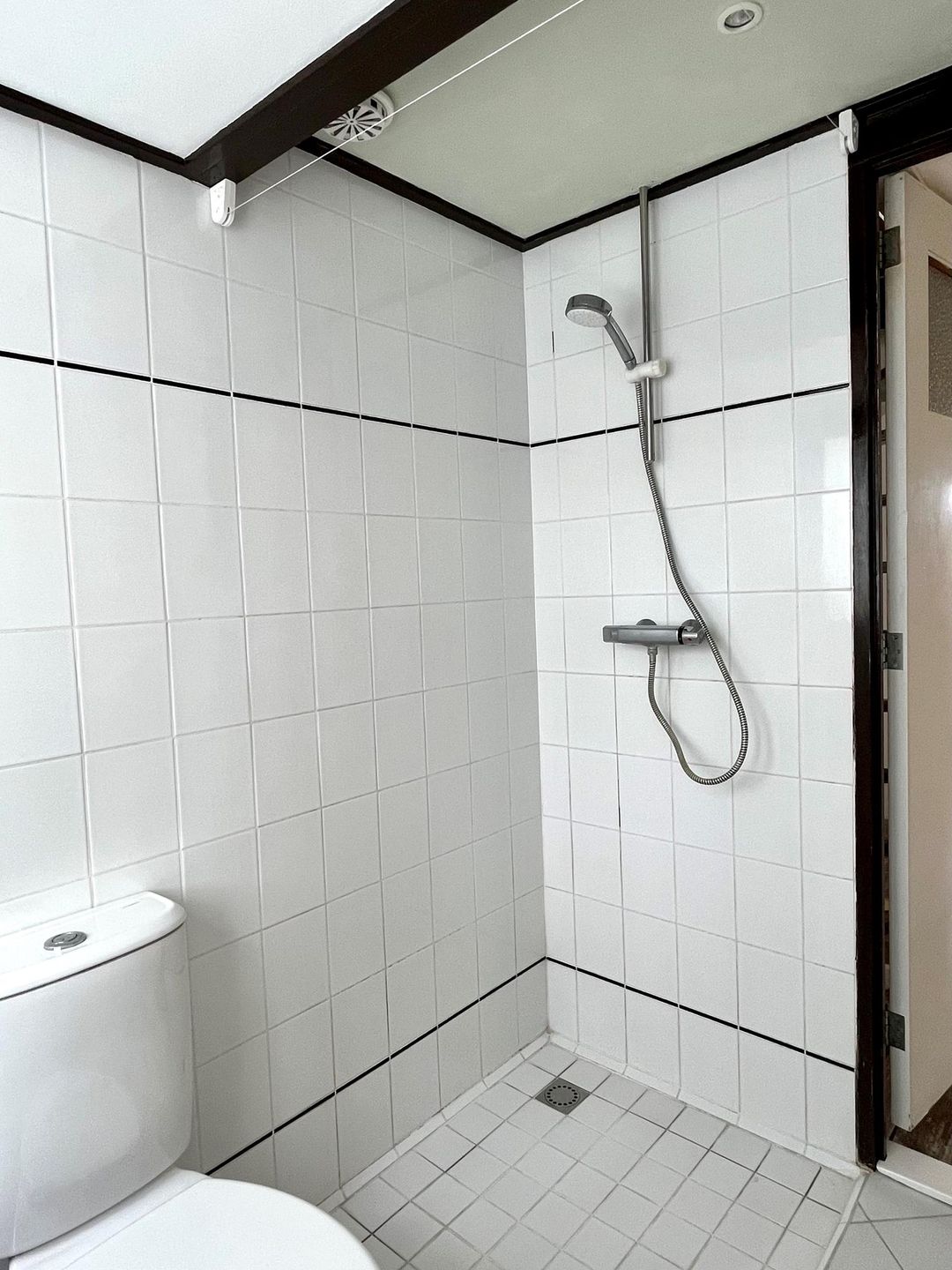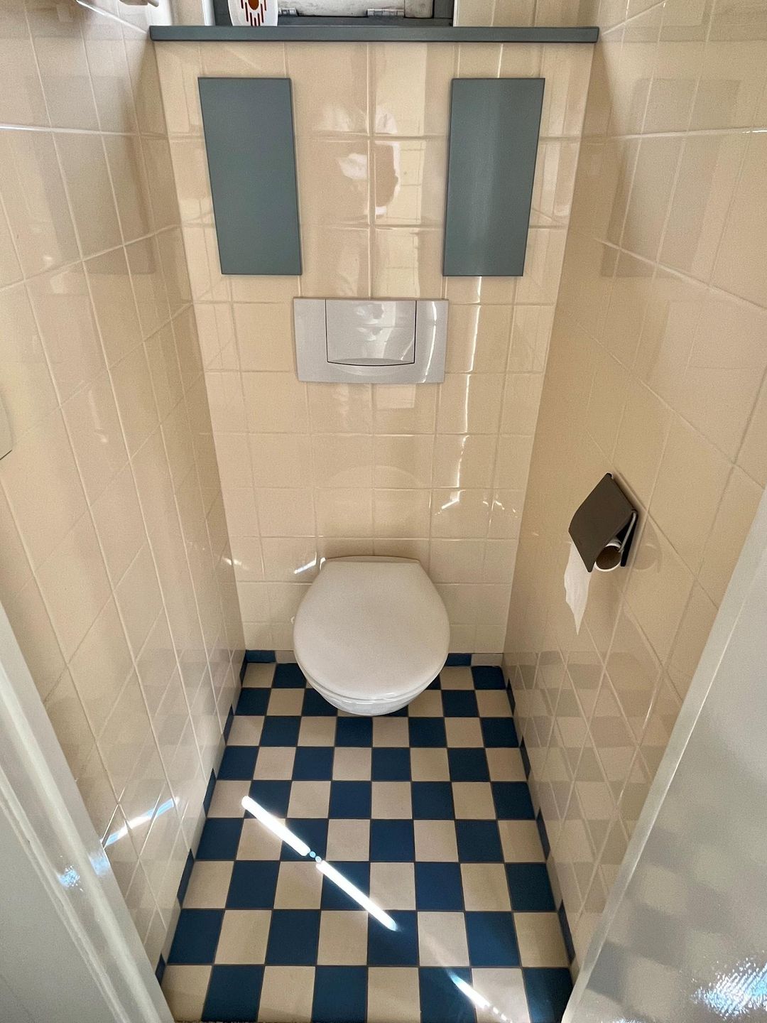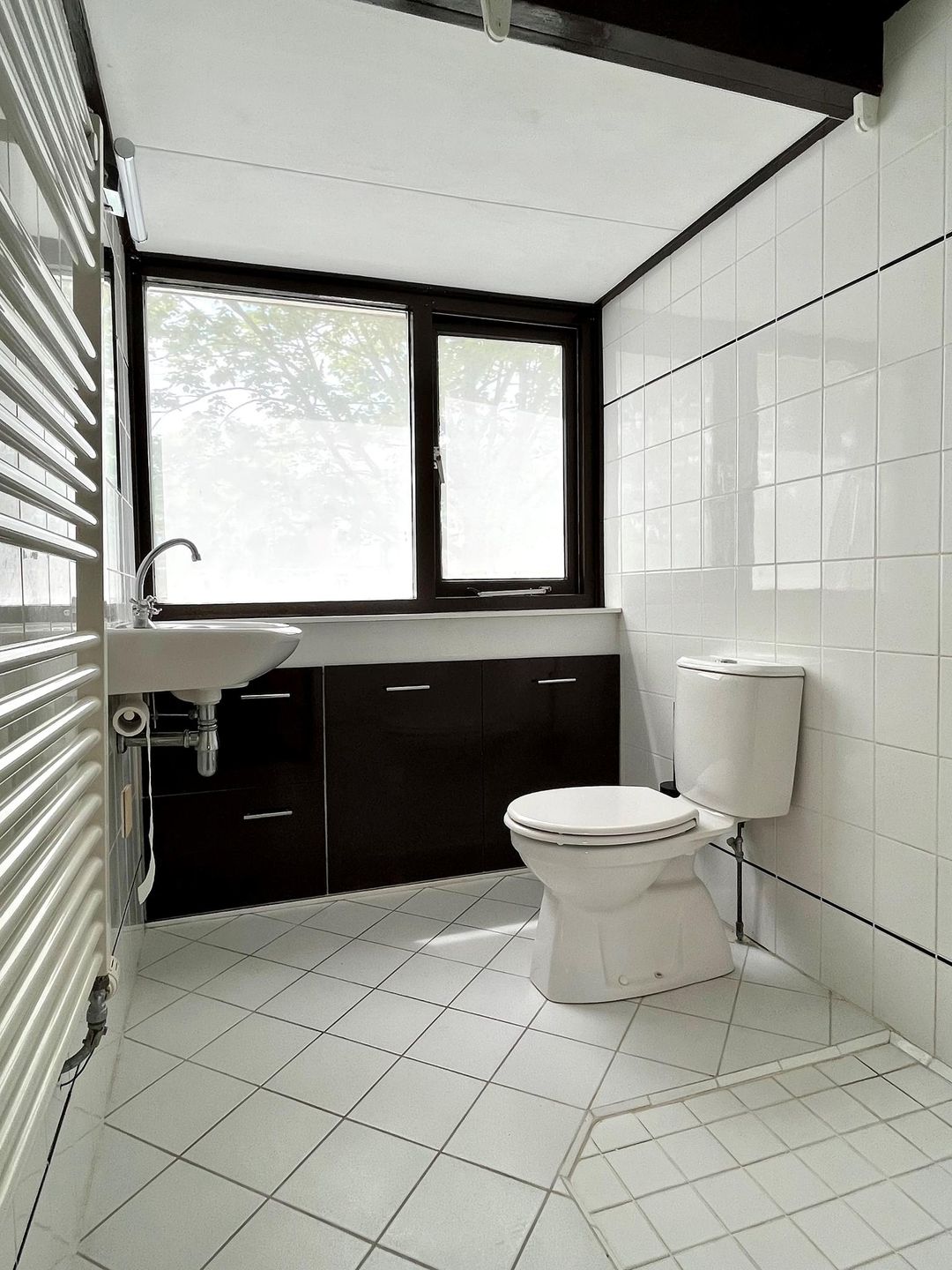 De badkamer is compact en slim ingedeeld. Hier treft u een douchehoek, 2e toilet en wastafel aan, alsmede bergruimte in het schuine dak gedeelte. Tevens is er vloerverwarming aanwezig (via de retourleiding van de radiator).