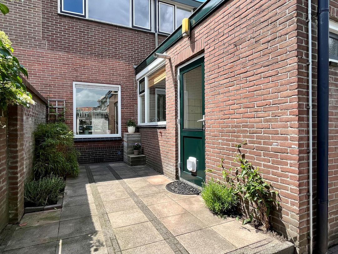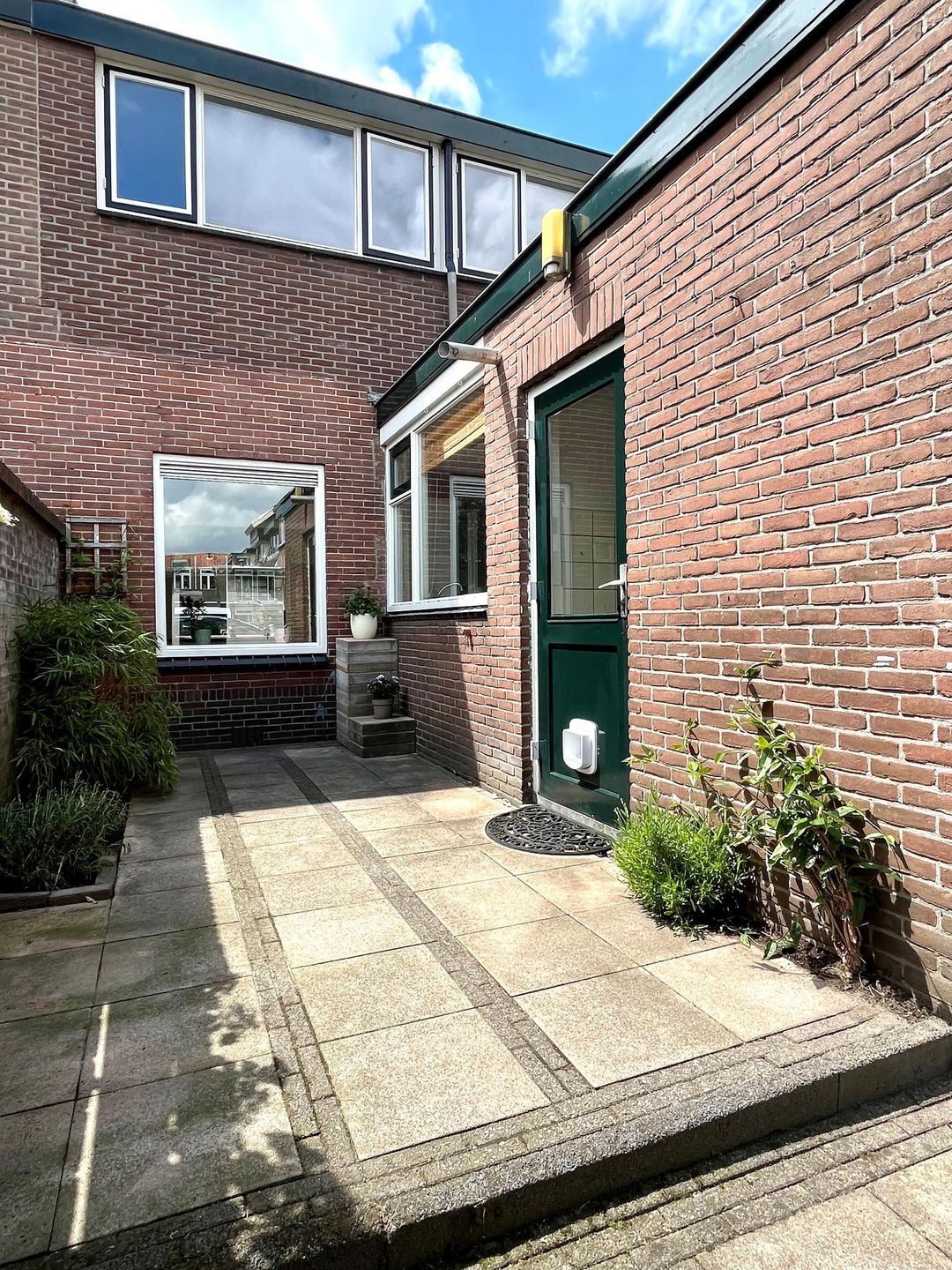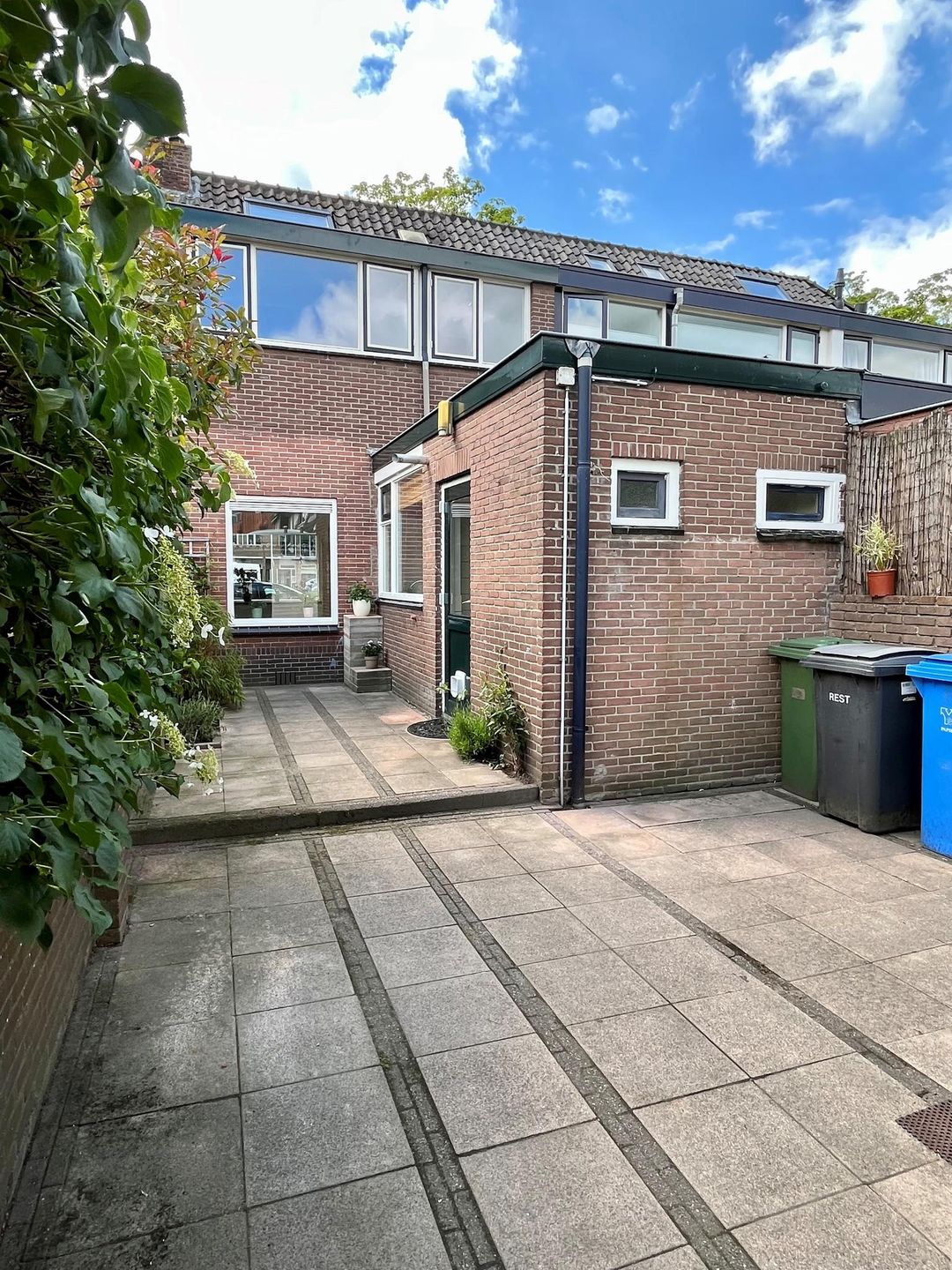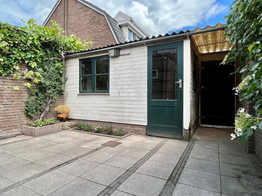 De achtertuin is ruim en heeft een vrije en open ligging. Vanwege de lengte van de tuin is er de gehele dag bezonning aanwezig. Een ruime houten berging aanwezig en een achterom.