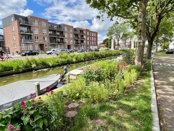 Aan rustige weg, aan water, in woonwijk, open ligging
